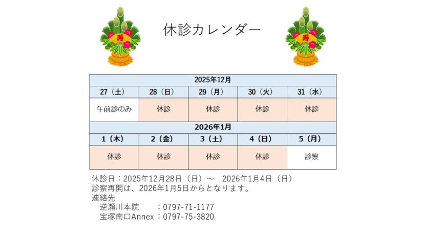 📅 休診期間2025年12月28日(日)~2026年1月4日(日)
